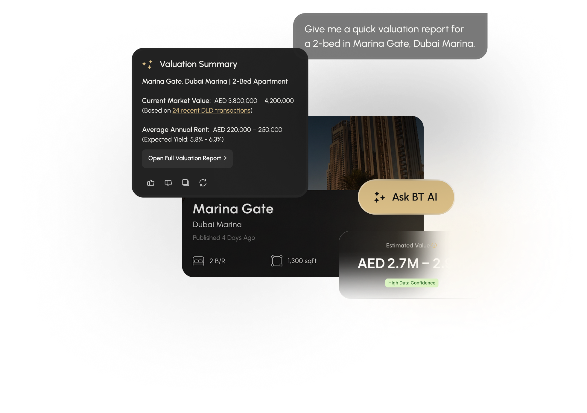 AI-powered valuations instantly based on Dubai Land Department transactions.